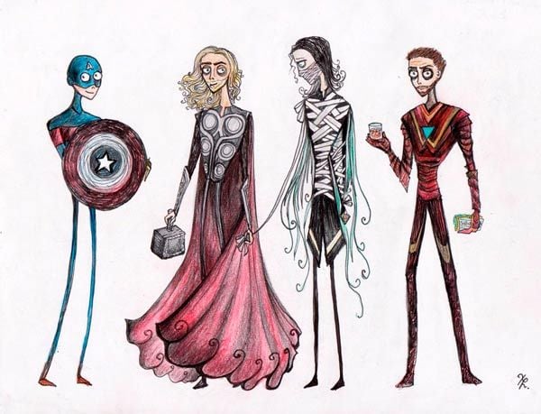 Ya hemos visto cómo quedaría el estilo de Tim Burton en los carteles de las películas Disney, los personajes de Juego de tronos y hasta los diferentes Pokémon, y ahora el universo del particular director va más allá y se atreve con los superhéroes. En 2014, la usuaria de DeviantArt La-Chapeliere-Folle creó un Loki 'Burtoniano' que fascinó a su seguidores y, a petición de ellos, convirtió a Los vengadores en personajes del cineasta.