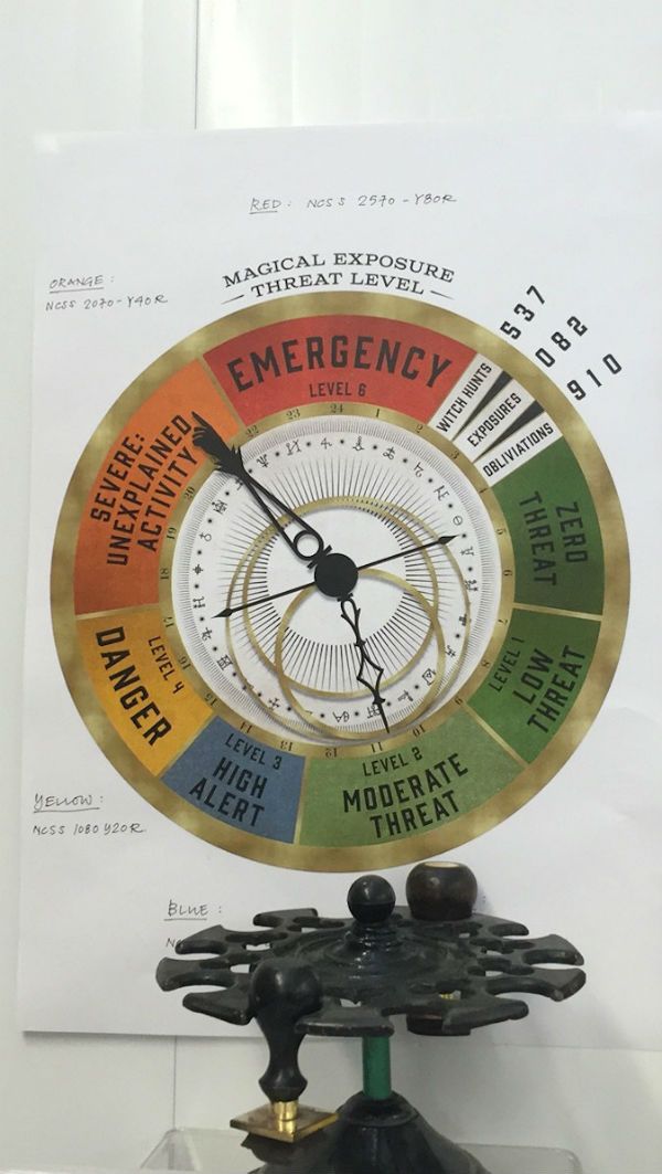 Las manillas indican el nivel de peligro: verde para una amenaza baja, azul para una alta, amarillo significa peligro, naranja indica una actividad severa inexplicable y el rojo se utiliza para avisar de una emergencia. Por otro lado, también cuenta el número de cazas de brujas en América, el número de veces que un mago ha sido expuesto y el número de veces que alguno de ellos ha tenido que utilizar un Obliviate, encantamiento para borrar la memoria, contra un No-Maj.