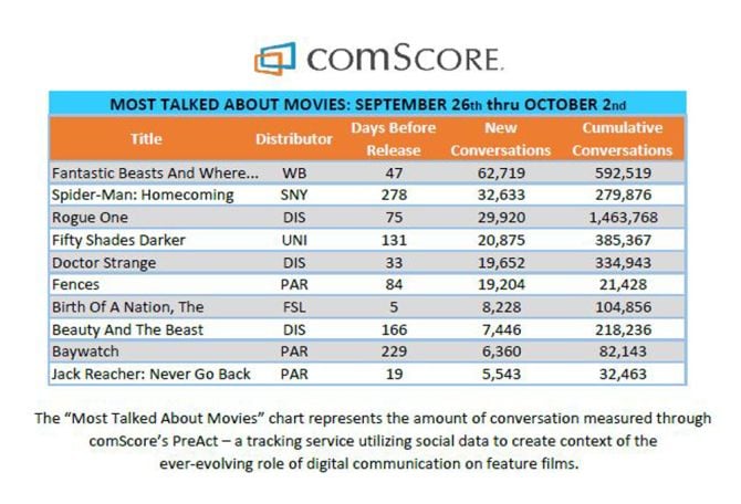 Además la cifra de 62.000 conversaciones en las redes sociales -‘tweets’, publicaciones en Facebook, publicaciones en Instagram, etc-, el 'spin-off' también ha superado a la promoción de algunos de los estrenos más esperados, como las imágenes de Tom Holland en el ‘set’ de Spider-Man: Homecoming paseándose en pijama (32.000 conversaciones), el video en ‘stop-motion’ para presentar los nuevos juguetes de Rogue One: Una historia de Star Wars (30.000 conversaciones), el ‘teaser’ que nos anunciaba la fecha de estreno del tráiler de Cincuenta sombras más oscuras (21.000 conversaciones) o la nueva película de Marvel, Doctor Strange (Doctor Extraño), que, con el estreno de los posters animados y el tráiler de la semana pasada, llegó a superar las 19.000 conversaciones.