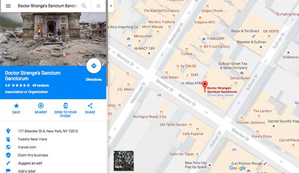 El primero en darse cuenta ha sido Chris Hewitt de la revista Empire. ¿Qué ha visto? El Sanctasanctórum de Doctor Strange (Benedict Cumberbatch), ¡y en Google Maps! Si escribes en Google "Doctor Strange’s Sanctum Sanctorum", el buscador te da como respuesta el número 177A de Bleecker Street en Nueva York. Figura como "Asociación o Negocio" y Marve.com aparece como su página web oficial. Se trata de la mansión del personaje creado por Steve Ditko y, al mismo tiempo, la base de los Defensores y de los Nuevos Vengadores. También es la concentración más grande de reliquias y trofeos místicos.
