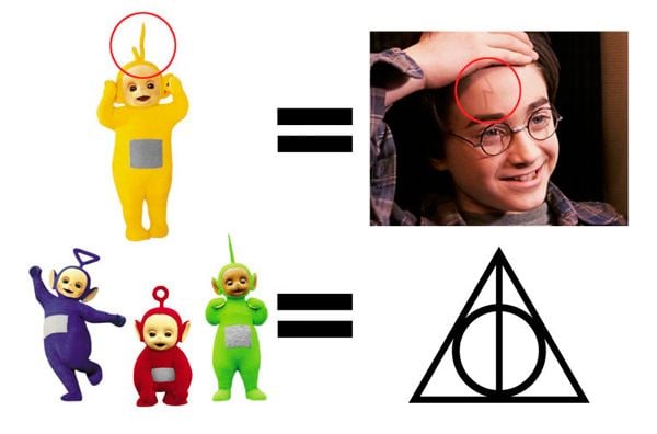 Desde este medio se hacen eco de la teoría que circula por Internet y que señala que J.K. Rowling se inspiró en las antenas que tienen Tinky Winky, Dipsy, Laa-Laa y Po en la cabeza para crear dos de los símbolos más reconocibles de la saga. Como puedes ver en la siguiente imagen, la antena de Laa-Laa estaría vagamente relacionada con la cicatriz de Harry Potter; mientras que la unión de los símbolos de Tinky Winky, Dipsy y Poo formaría las famosas Reliquias de la Muerte.