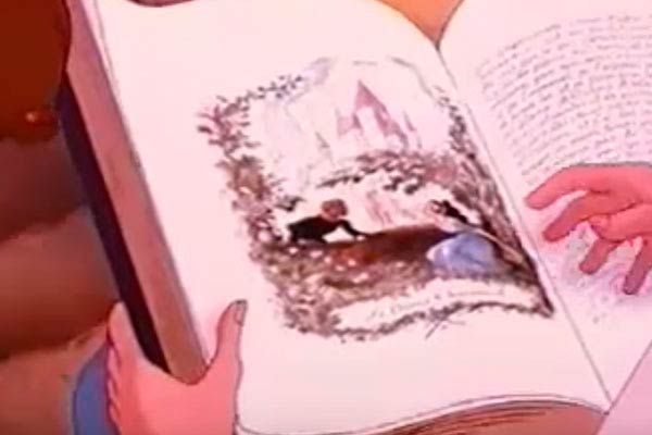 5. Cuando Bella está sentada en la fuente durante la primera canción mirando un libro, puedes ver una imagen en él de una doncella, un monstruo y un castillo.