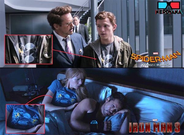Tras descubrir la aparición de otro Vengador en el tráiler, ahora un usuario ha publicado una imagen de NerdVana que une un momento de tráiler en el que Tony Stark y Peter Parker hablan con otro de Iron Man 3 en el que el magnate está durmiendo junto a Pepper Potts (Gwyneth Paltrow). Lo peculiar de ambas fotografías es que tanto Parker como Potts llevan la misma camiseta, una en la que se puede ver a dos átomos hablar: el primero dice "¡He perdido un electrón!", a lo que el segundo se responde "¿Eres positivo?".