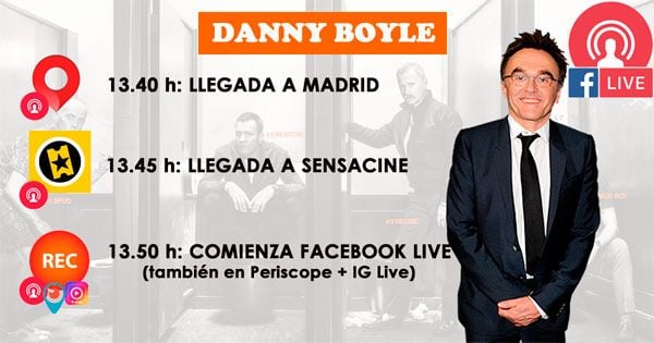 El ganador del Oscar Danny Boyle visita hoy jueves 2 de febrero la redacción de SensaCine. El cineasta británico, responsable de títulos como 28 días después..., Slumdog Millionaire o Steve Jobs, hará un #FacebookLIVE desde nuestro plató para hablar de su última película, T2 Trainspotting, en cines a partir del 24 de febrero. Bajo estas líneas puedes ver cómo será exactamente este día tan especial, desde nuestro encuentro con él en la calle (13.40 horas) hasta una conexión posterior con la redacción (13.45) y el encuentro en vivo desde el plató (13.50 horas). También ofreceremos la charla en directo a través de Twitter (Periscope) e Instagram LIVE. Y lo mejor de todo es que serás tú, a través de tus comentarios, quien le hagas las preguntas. ¡Acuérdate de escribirlas en los comentarios!