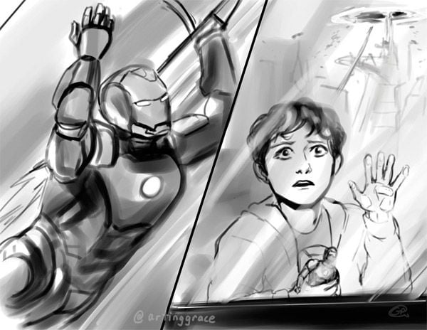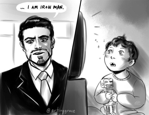 ¿Te imaginas que Tony (Robert Downey Jr.) fuera no sólo el mentor de Peter (Tom Holland) sino también su héroe? Así lo imagina el 'fan art' de @artinggrace, que insinúa que el futuro Trepamuros de Marvel habría empezado a seguir a Stark desde 2008, cuando confesó que él era el Vengador Acorazado. Después llegó Los Vengadores en 2012 y finalmente la charla que mantienen Tony y Peter en el tráiler.