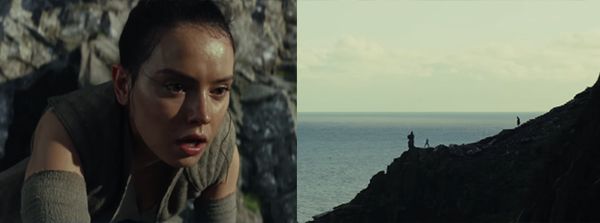 Esta es la primera película de Star Wars que comienza justo después del final de la anterior, es decir, Rey sigue en la isla con Luke y ahora él le está enseñando cómo usar la Fuerza y como aprender a manejar un sable láser. Partes de este entrenamiento se pueden ver en el tráiler, un ejemplo es la imagen superior, cuando ella está al borde del precipicio moviéndose sin parar.