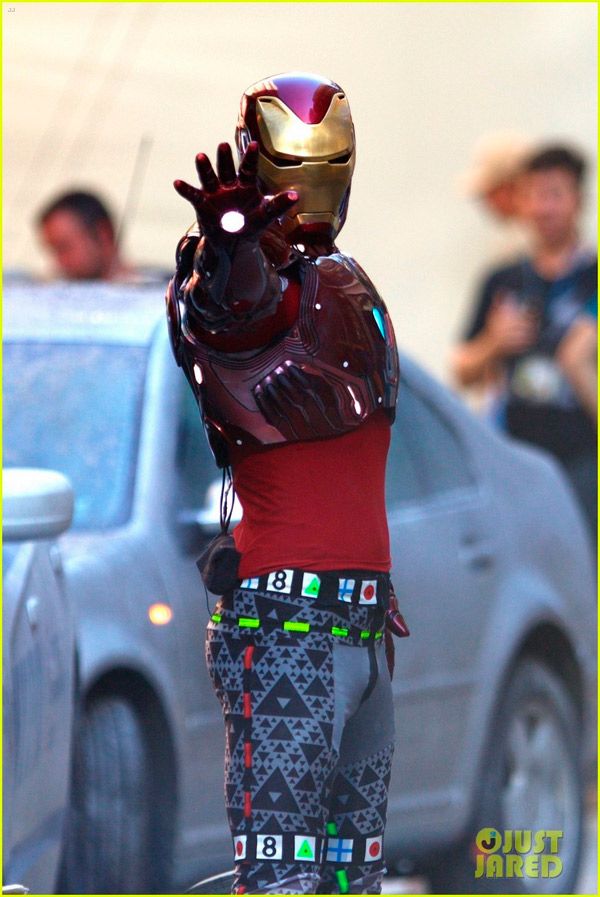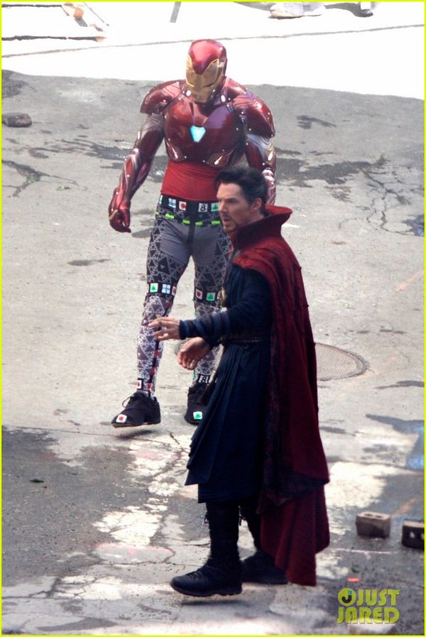 Aunque el actor Robert Downey Jr. ha estado grabando escenas estos días en Atlanta (EE.UU), en esta ocasión lo más seguro es que sea un doble quien acompañe a Mark Ruffalo, Benedict Cumberbatch y Benedict Wong (Wong). El traje (parcial) es bastante diferente a la anterior armadura de Iron Man, con un nuevo diseño triangular para el reactor y lo que parecen ser unas hombreras reforzadas. En los brazos y en el casco también se pueden apreciar pequeños cambios. ¿Pero por qué parece que Tony está enfrentándose a sus compañeros? ¿Quizá le controlará Thanos con el Guantelete?