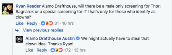 En concreto, especifican que deben vestirse de payasos y acudir pronto, pues podrán pintarse la cara en el evento, tomarse fotos y ganar premios. Esta original idea surge de una proyección anterior que organizó Drafthouse a raíz del estreno de Wonder Woman, cuando realizaron un pase exclusivo para mujeres. Algunas personas se sintieron ofendidas por esta iniciativa, lo que llevó a un usuario a preguntar si habría una proyección "solo para hombres de Thor: Ragnarok o una de It para quienes se identifiquen como payasos", como ha recogido Polygon. Ya en aquel momento la cadena respondió que quizá le robasen la idea, como finalmente han hecho.