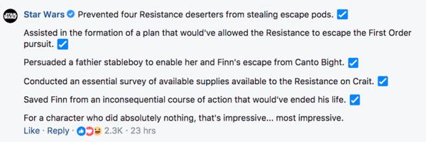 Estas críticas no iban a quedar sin respuesta por parte de Star Wars y, en lugar de entrar en el debate de si Rose es mejor o peor que Jar Jar, la cuenta oficial ha aportado tres poderosos argumentos sobre su nuevo personaje: 1) "Evitó que cuatro desertores de la Resistencia robaran cápsulas de escape. Ayudó en la creación de un plan que habría permitido a la Resistencia escapar de la persecución de la Primera Orden". 2) "Persuadió a un mozo de cuadra de los fathiers para que ella y Finn escaparan de Canto Bight. Llevaron a cabo un plan esencial de los suministros disponibles para la Resistencia en Crait".