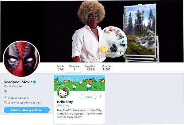 Sí, a la cuenta oficial de Hello Kitty. Esto deja claro que es alguien con ideas muy claras y que lo único que le importa es lo que cuente esta famosa muñeca. Cabe señalar también que pese a llevar 3 años en Twitter, tiene menos de 600 tuits publicados, porque es muy selectivo con lo que dice, aunque esperemos que este número aumente conforme se acerque el estreno de Deadpool 2 y así conozcamos más secretos de la producción.