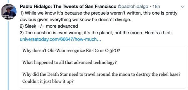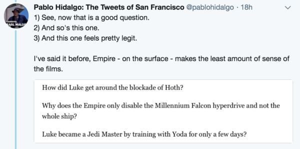 Todo ha comenzado a raíz de un artículo publicado por Esquire en el que mencionaban lo que ellos consideraban todos los agujeros de guion de la franquicia. Sin embargo, Hidalgo no estaba de acuerdo con la mayoría, motivo por el cual ha decidido aclarar algunos puntos a la vez que reconocía que El Imperio Contraataca es la culpable de la mayoría de inconsistencias internas del universo galáctico.