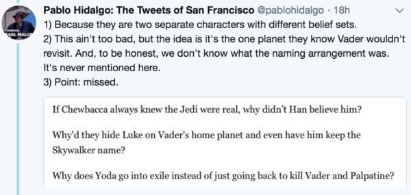 Entre otras cuestiones, ha aclarado que Chewbacca creía en los Jedi pero Han Solo no porque, a pesar de que son amigos, son "dos personajes diferentes con creencias distintas", que Luke fue escondido en el planeta natal de Darth Vader porque "es el único lugar en el que sabían que no miraría" o que Obi-Wan no reconocía a RD-D2 y C-3PO simplemente "porque las precuelas no estaban escritas".