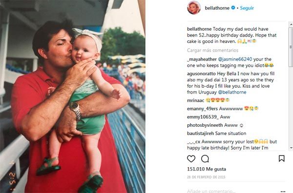 Con sólo 9 años, Bella Thorne tuvo que enfrentarse a la repentina muerte de su padre en una accidente de moto. La actriz ha mostrado en varias ocasiones esta tierna imagen en la que aparece ella cuando era un bebé junto a su padre, al que felicita cada año en sus Redes.