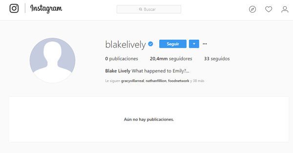 Este movimiento ha llamado la atención de sus más de 20 millones de seguidores y de todos los medios, especialmente al comprobar que Lively ha optado por seguir a 33 mujeres llamadas Emily Nelson y que su perfil solo cuenta con la siguiente descripción: "What happened to Emily?..." ('¿Qué le ha pasado a Emily?').