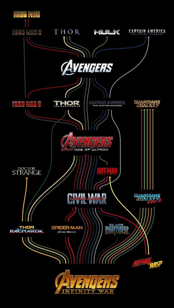 El usuario de Reddit Cheesenaut ha diseñado una sencilla y visual línea temporal, que reúne en una sola imagen las aventuras de cada uno de los protagonistas, ayudando a crear una especia de cronograma que conecta todos los trabajos, tomando como eje central los trabajos grupales, como Los Vengadores o Capitán América: Civil War.