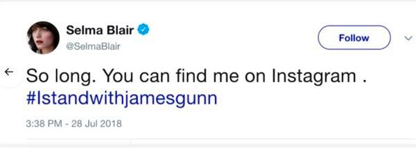 La polémica provocada por el despido de James Gunn de Marvel Studios continúa y el director de Guardianes de la Galaxia y Guardianes de la Galaxia Vol. 2 ha ganado un nuevo apoyo en las redes sociales. La actriz Selma Blair (Hellboy, American Crime Story) ha cerrado su cuenta de Twitter como apoyo al realizador con el siguiente mensaje: "Hasta la próxima. Puedes encontrarme en Instagram", y el hashtag: #ApoyoAJamesGunn". Puedes ver una captura del mensaje -que también ha desaparecido tras cerrar su cuenta- a continuación: