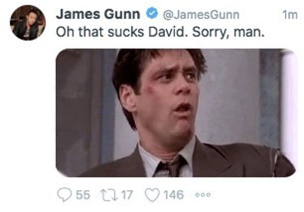 "Oh eso apesta David, lo siento tío", es el mensaje que acompaña a un gif. de Jim Carrey de la película Mentiroso compulsivo, que ha confundido aún más a los usuarios. Aunque hay uno llamado Scott Gustin que podría haber encontrado la solución en un viejo mensaje de Gunn a David Hasselhoff el pasado verano sobre la muerte de su mascota.