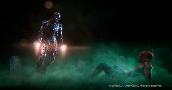 Ocurre a mitad de película, cuando Peter Parker ha descubierto cuál es el verdadero plan de Quentin Beck/Mysterio (Jake Gyllenhaal). El villano utiliza su tecnología y sus drones para crear una serie de ilusiones con las que atormentar al superhéroe y una de ellas incluye ponerle cara a cara con un Tony Stark/Iron Man (Robert Downey Jr.) zombie saliendo de su tumba.