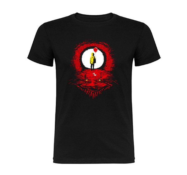 Si prefieres algo más sutil, pero a la vez más tenebroso, sin duda tu diseño es el que puedes ver bajo estas líneas. En esta camiseta, de color negro, destaca la famosa silueta de Georgie, con su inolvidable chubasquero amarillo y su globo rojo, sobre un fondo rojo en el que se vislumbra la aterradora sonrisa de Pennywise. ¿Con cuál te quedas?