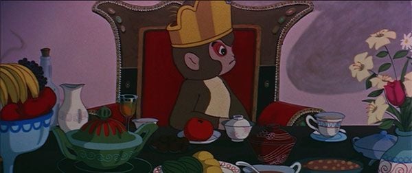 Después de una canción interpretada por cuatro 'monetes', Alakazam emplea todo su arrojo y se tira al agua sin pensárselo dos veces. Accede al palacio encantado con el agua sobre sus ojos y, no sabemos cómo, vuelve a salir a la superficie con la ayuda de una puerta de la residencia. Lo que no nos cuentan es cómo es capaz un pequeño mono de levantar una plancha de madera de ese tamaño. Debido a su proeza, Alakazam ya es rey. Así de fácil. Pero ni mucho menos un buen gobernante. "Ojalá pudiera decir que Alakazam era un buen rey. Un rey sabio", se lamenta el narrador. "Pero no. Era tonto y arrogante. En realidad, no hacía nada bien. La verdad es que la corona no estaba hecha para él". Efectivamente, y a pesar de contar con sirvientes, bailarinas y con la compañía de Didi, a nuestro protagonista no le agrada, por ejemplo, repetir faisán para comer. Es déspota y altanero y se burla de los seres humanos pese a que Didi le dice que es "el animal más listo de todos". "¿Más que Alakazam?". En la nueva casa de este hay colgado un cuadro con la imagen de Merlín, del que nos dicen que practica todos los tipos de magia secreta en la Montaña Solitaria. Con envidia y miedo, y después de tener una pesadilla en la que es encerrado y observado por humanos, Alakazam le lanza al lienzo de Merlín un racimo de uvas... aunque luego tira su corona al suelo y decide emprender un viaje a la Montaña Solitaria. "Tengo que estudiar y aprender sus poderes mágicos", confiesa. Didi quiere ir con él, pero... "A los magos no les gustan las chicas. Las cortan en pedacitos". Esa es la idea de Alakazam y juro que con pocos años ni siquiera me fijé.