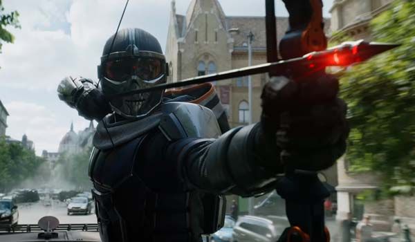 En la persecución en la que él intenta alcanzar a Natasha y Yelena Belova (Florence Pugh), imita, con el arco, a Clint Barton/Ojo de Halcón (Jeremy Renner).
