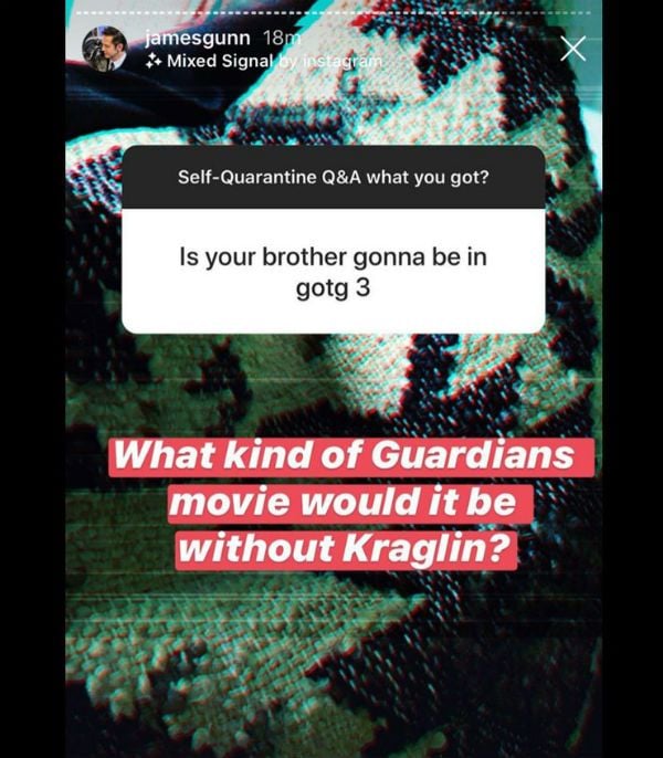 El reparto para el filme todavía no está confirmado del todo, pero el director y guionista ha revelado que la historia ya está escrita. Si bien es cierto que no puede desvelar ningún 'spoiler', Gunn ha confirmado recientemente la reaparición de Kraglin durante una ronda de preguntas y respuestas en Instagram. Cuando un fan le ha preguntado sobre el tema, el realizador ha respondido lo siguiente: "¿Qué tipo de película de los Guardianes sería sin Kraglin?".