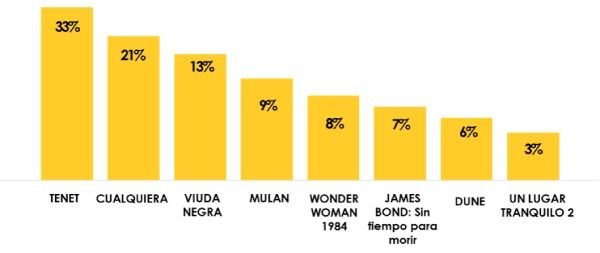 A la hora de escoger película para volver al cine, Tenet (17 de julio) de Christopher Nolan es la gran favorita, elegida por un 33% de los encuestados, aunque el hecho de que el 21% esté dispuesto a ver cualquier película también demuestra las ganas de volver al cine. Viuda Negra (30 de octubre) de Cate Shortland, debut de la Fase 4 de Marvel Studios con Scarlett Johansson; Mulán (24 de julio), el nuevo 'remake' de acción real de Disney, dirigido por Niki Caro y con Yifei Liu como la heroína de leyenda, y Wonder Woman 1984 (14 de agosto), de Patty Jenkins y con Gal Gadot como la Mujer Maravilla de DC Comics, completan el 'Top 5'. Justo detrás encontramos Sin tiempo para morir (12 de noviembre), la despedida de Daniel Craig como James Bond; Dune (18 de diciembre), adaptación de Denis Villeneuve de la novela homónima de ciencia ficción de Frank Herbert, ya llevada al cine en 1984 por el cineasta David Lynch, y la secuela Un lugar tranquilo 2 (4 de septiembre) de John Krasinski, con Emily Blunt.