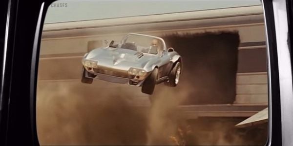 Uno de los coches utilizados en la escena es un Chevrolet Corvette Grand Sport de 1963. Lógicamente, no podían destruir el coche auténtico, por lo que los productores encargaron 12 réplicas para la grabación, muchas de las cuales quedaron totalmente destrozadas. Los que se utilizaron para las acrobacias estaban prácticamente huecos, mientras que el que conducen los protagonistas tenía el equipamiento de otros coches. Varios de ellos fueron lanzados por un cañón de aire a través de un tren y hacia el lago en el fondo de un acantilado.