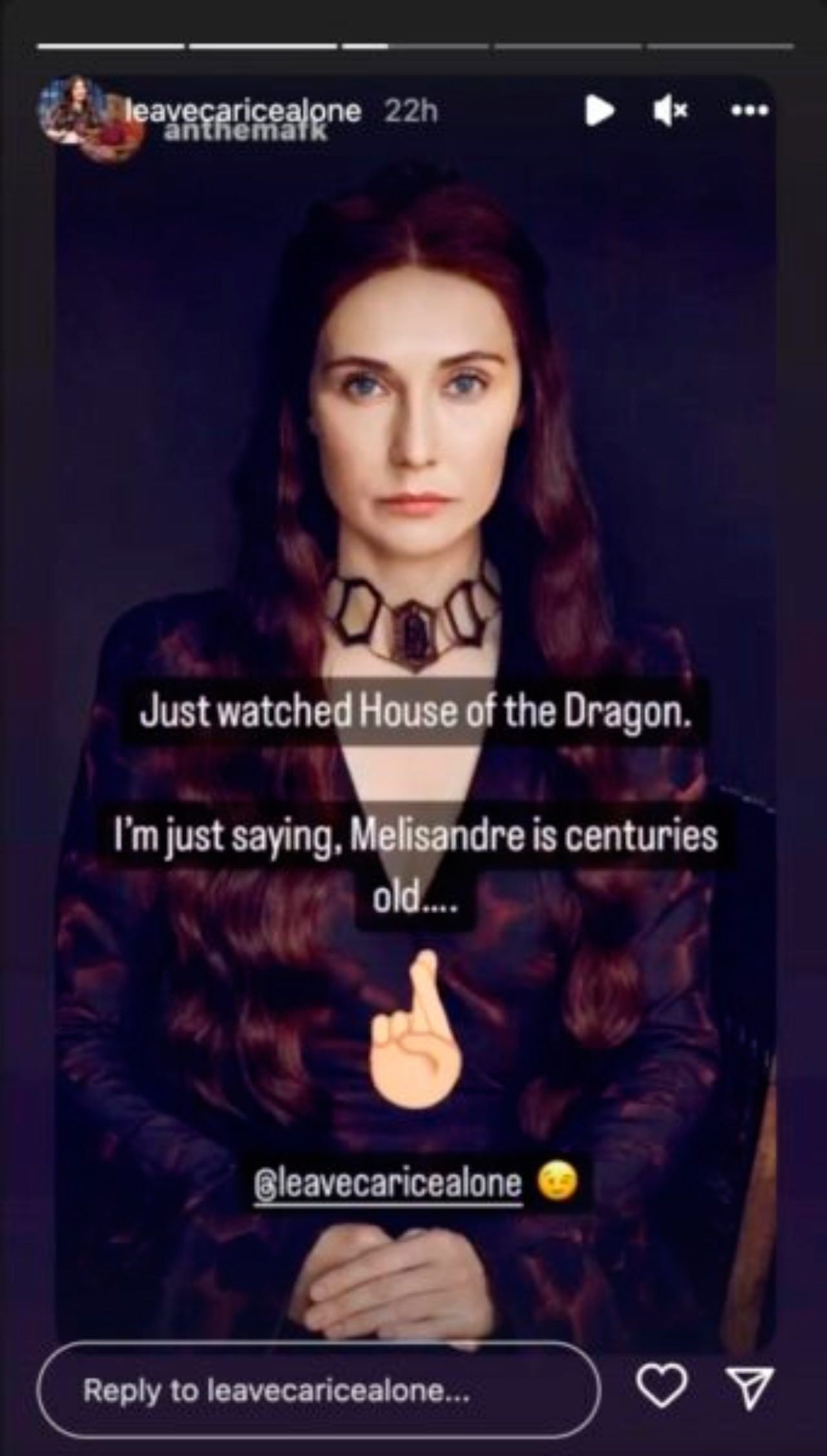 De hecho, la propia actriz reconoció creerlo así y hasta cruza los dedos. Lo ha hecho mediante una storie de Instagram que recuerda a los seguidores que Melisandre tiene siglos de edad.