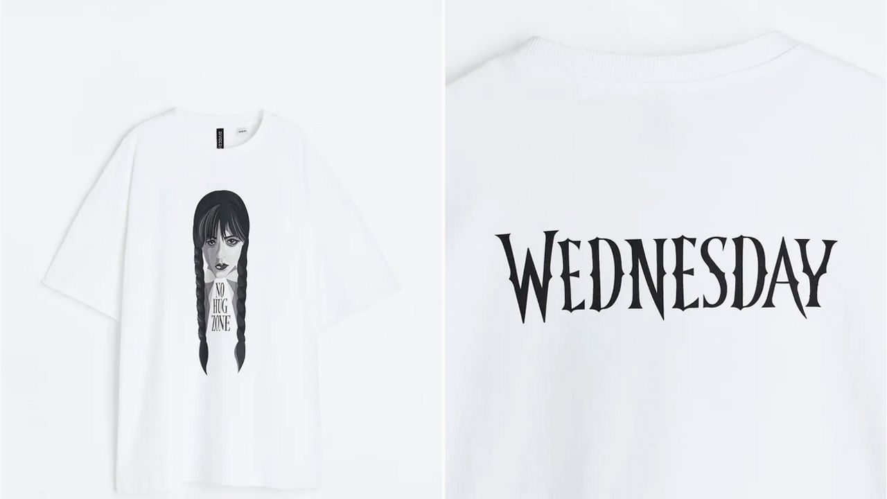 Una camiseta 'oversize' de algodón y color blanco con la cara de Miércoles y sus largas trenzas como protagonistas y un mensaje que le va como anillo al dedo: "No Hug Zone". Es decir, que esta "no es una zona de abrazos".
