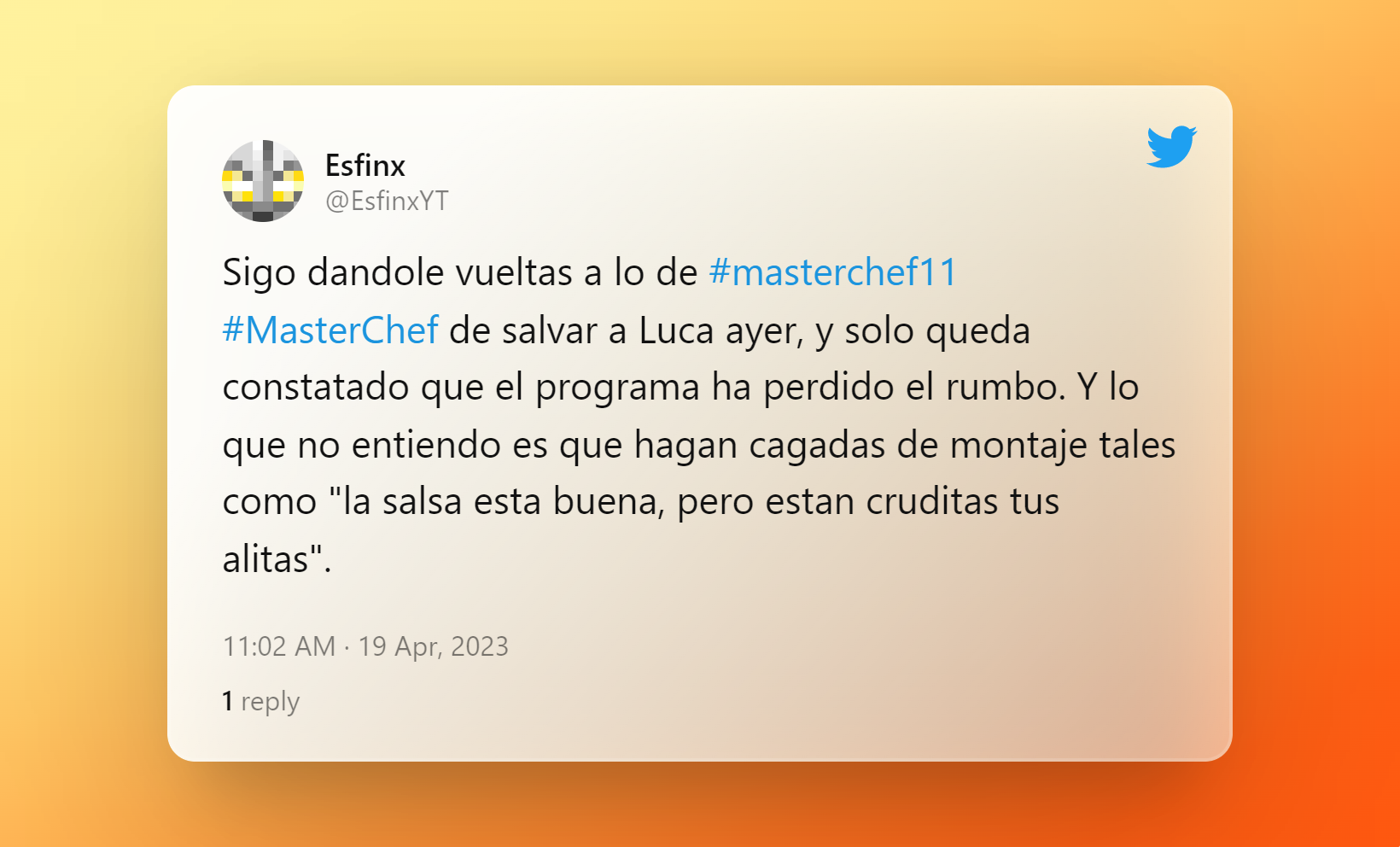 ¿Por qué sigue en MasterChef Luca? ¿Es más importante el "show" que el cocinado? ¿Cuándo le expulsaran los jueces? Son algunas de las preguntas que se hace la audiencia, y más viendo cómo día a día sigue el 'tiktoker' mientras sus elaboraciones son algo básicas. "Sigo dándole vueltas a lo de salvar a Luca ayer, y solo queda constatado que el programa ha perdido el rumbo. Y lo que no entiendo es que hagan cagadas de montaje tales como 'la salsa esta buena, pero están cruditas tus alitas'", escribe un usuario en Twitter.