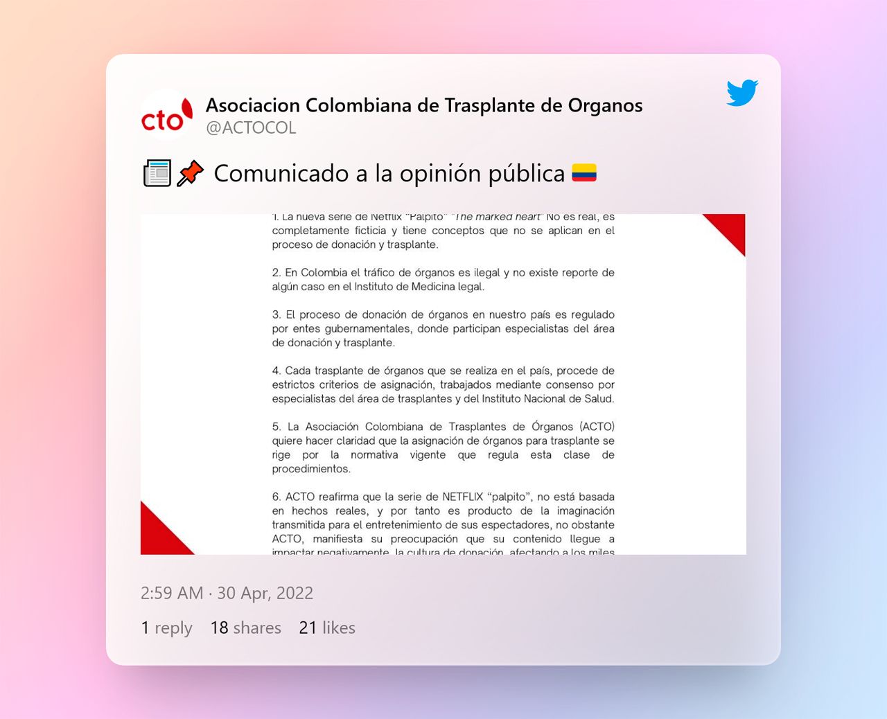 "ACTO reafirma que la serie Netflix 'Pálpito' no está basada en hechos reales y por tanto es producto de la imaginación transmitida para el entretenimiento de sus espectadores", reza el comunicado. "ACTO manifiesta su preocupación de que su contenido llegue a impactar negativamente en la cultura de la donación, afectando a los miles de pacientes que en la actualidad se encuentran en lista de espera".