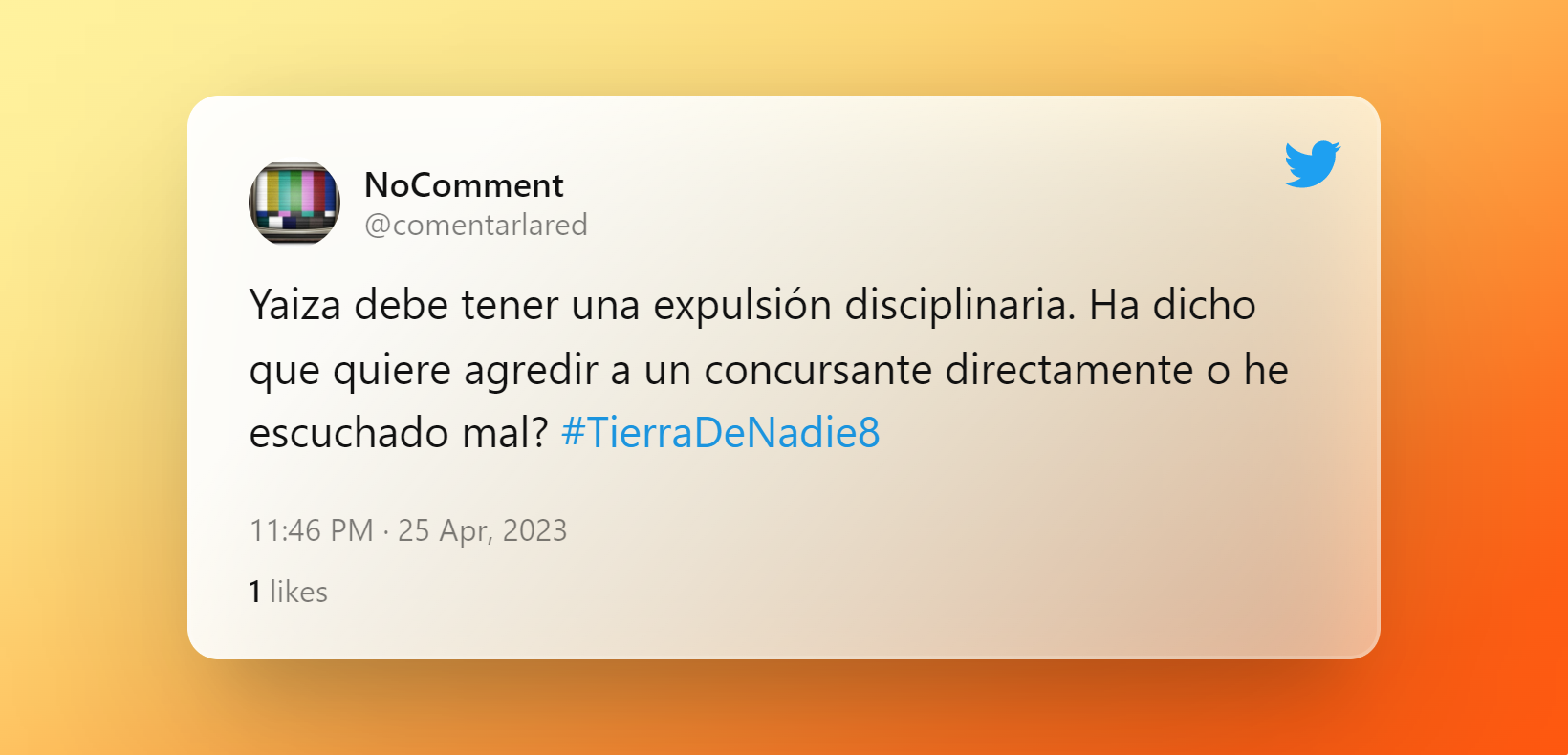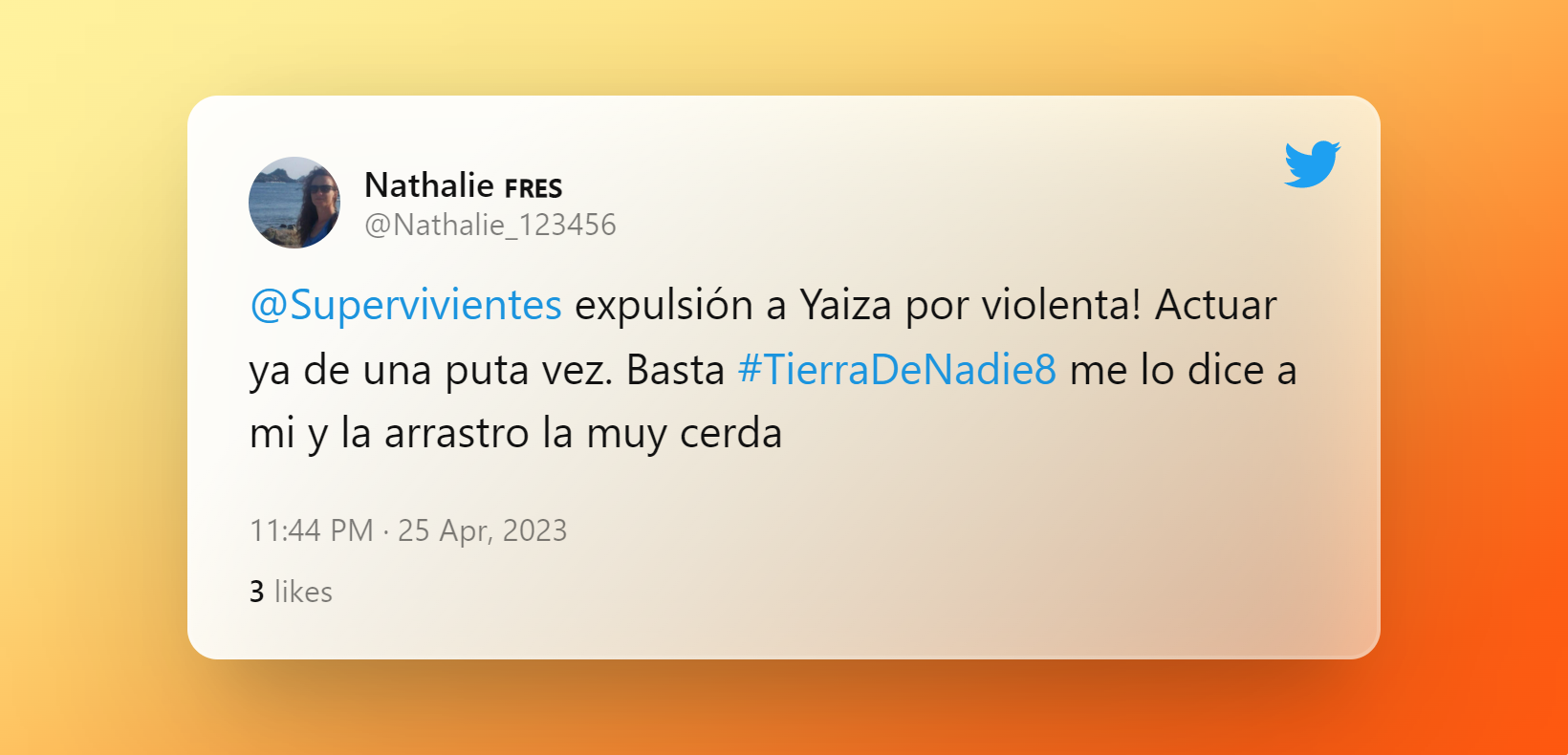"12 meses, 12 tongos": los espectadores de 'Supervivientes 2023' estallan contra el 'reality' tras la salvación de YaizaEl agresivo comentario de Yaiza también ha hecho estallar los espectadores, quienes piden la expulsión disciplinaria de la concursante en las redes sociales. "Yaiza debe tener una expulsión disciplinaria. ¿Ha dicho que quiere agredir a un concursante directamente o he escuchado mal?", escribe un usuario en Twitter. "Expulsión a Yaiza por violenta", reclama otro espectador en la conocida red social.