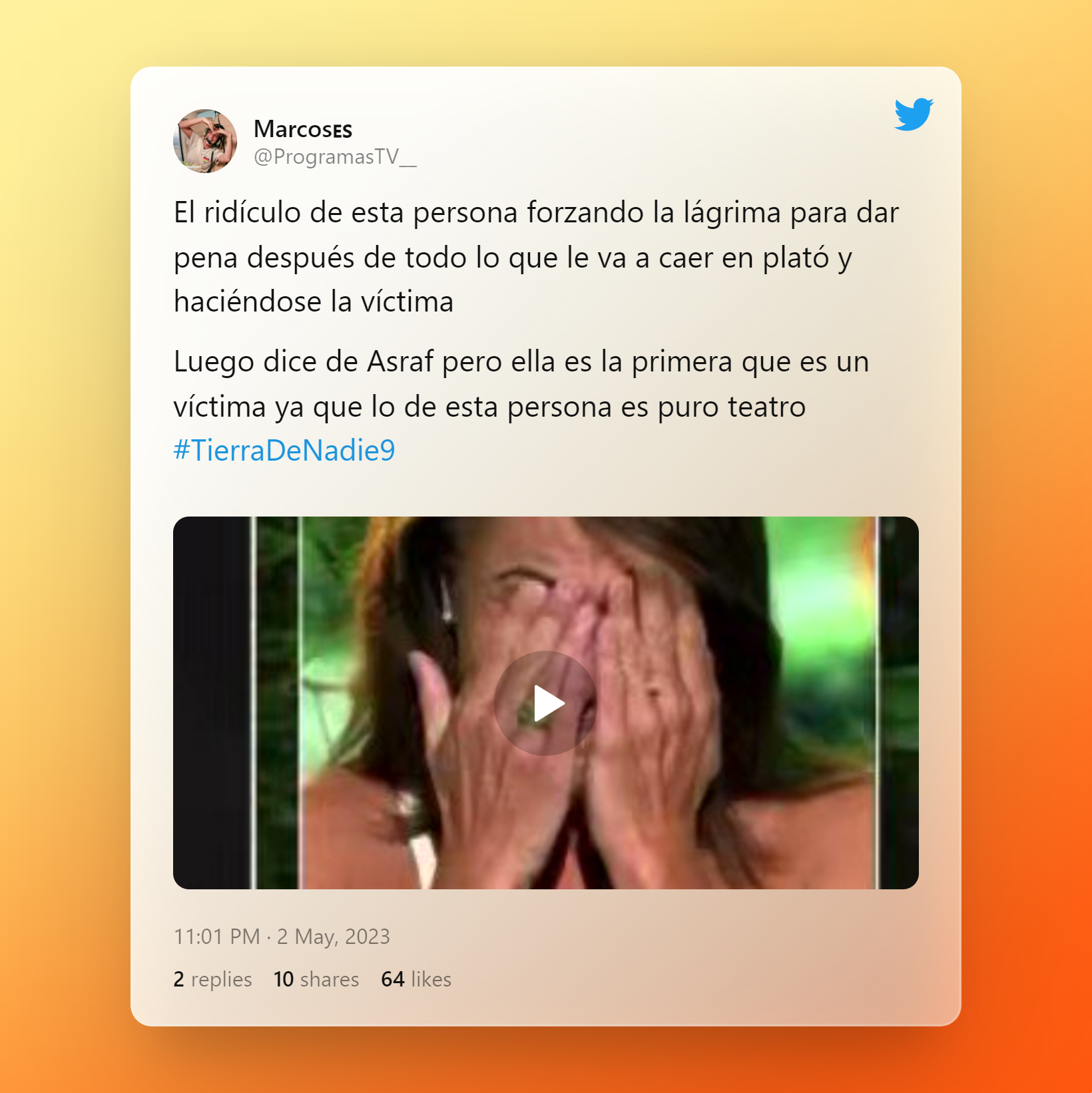 "Necesito que me dejen en paz": Merce deja 'MasterChef 11' con "orgullo" y ganas de volver a su casa"Que bochornoso el teatro", "se está riendo de todos en sus caras", "vaya cambiazo en 5 días, no se lo cree nadie" o "al igual que esta pidiendo perdón ahora lo ha podido hacer perfectamente en la isla" son algunas de las reacciones que se pueden leer en la conocida red social. "El ridículo de esta persona forzando la lágrima para dar pena después de todo lo que le va a caer en plató y haciéndose la víctima", sentencia otro espectador en Twitter.