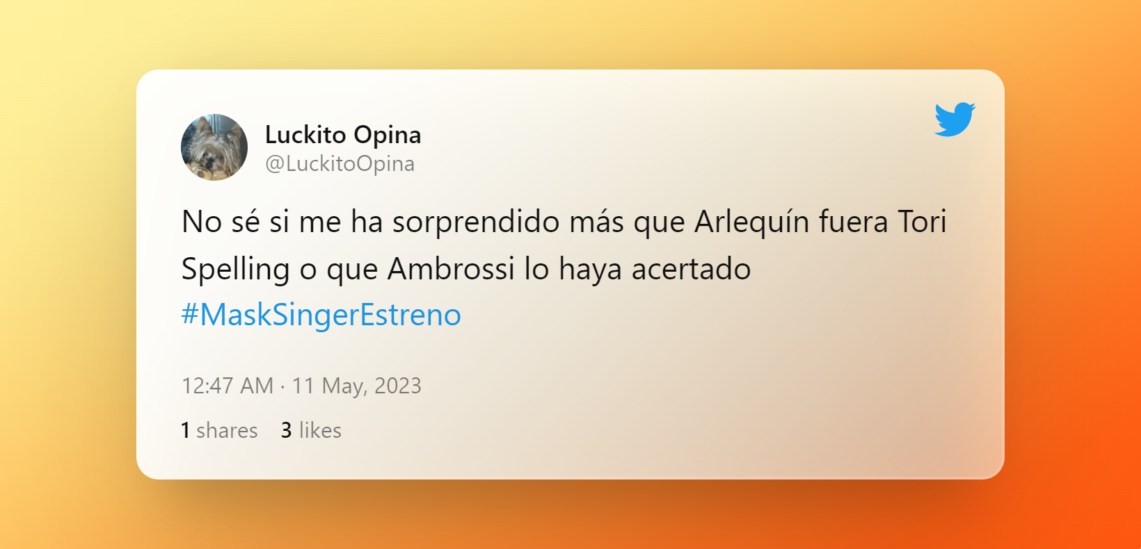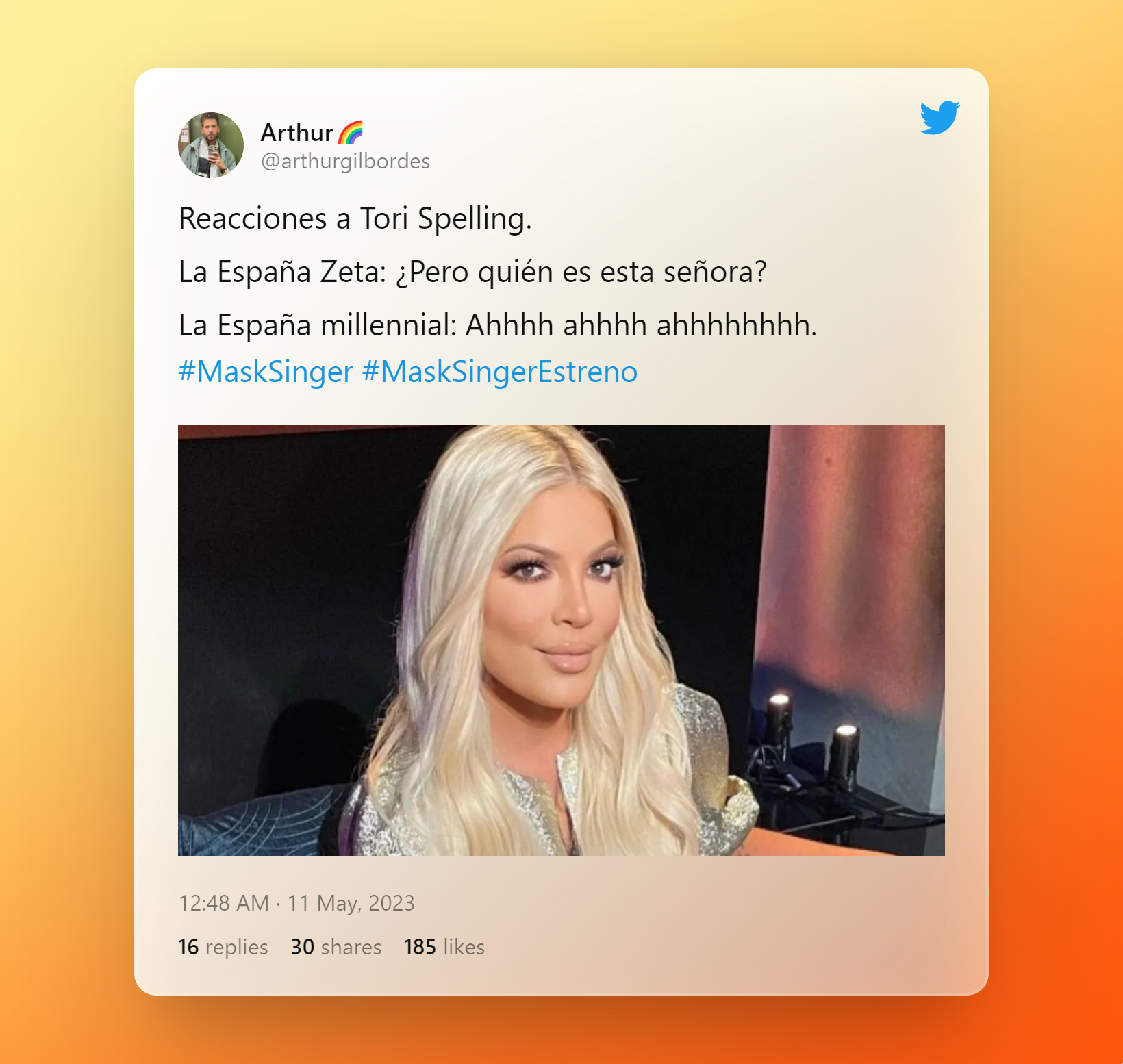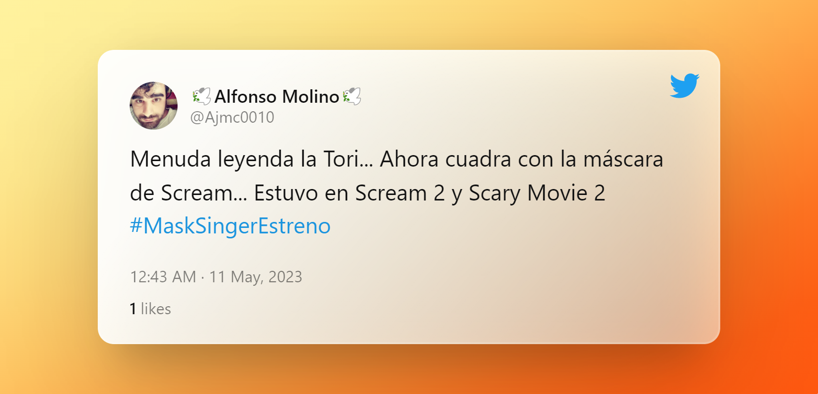 "Mi cabeza no para": Pablo Alborán confiesa en 'El Hormiguero' su "pesadilla" a la hora de dormir"Después de ver a Tori me han venido los recuerdos de Sensación de Vivir", reconoce un espectador en Twitter. "Ya lo he visto todo", "flipando", "no sé si me ha sorprendido más que Arlequín fuera Tori Spelling o que Ambrossi lo haya acertado", "me caigo muerto", "menuda leyenda la Tori" o "ahora cuadra con la máscara de Scream" fueron otras de las reacciones de los espectadores.
