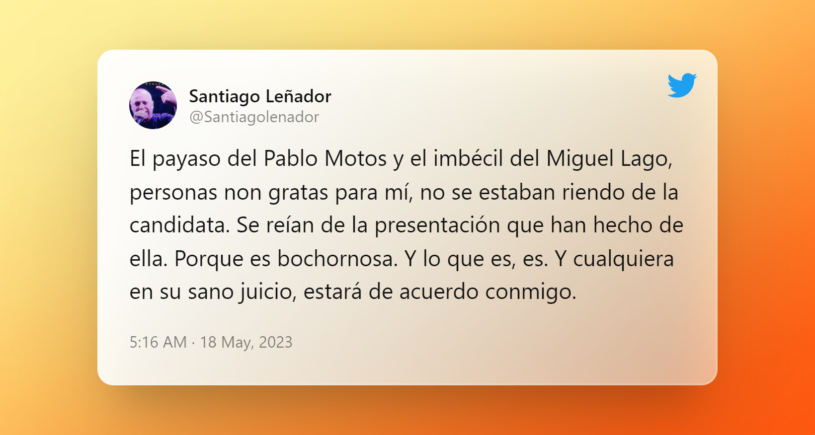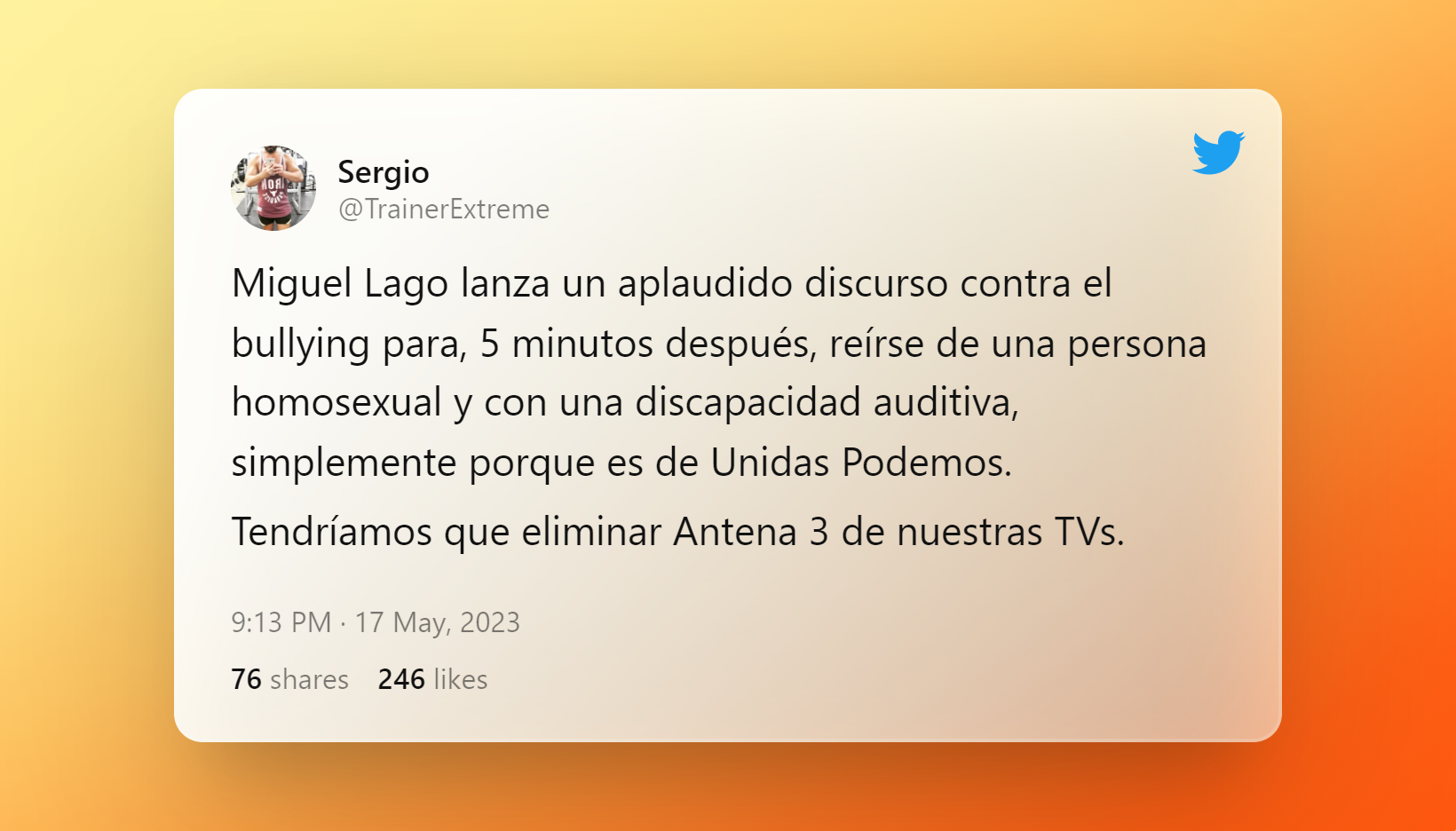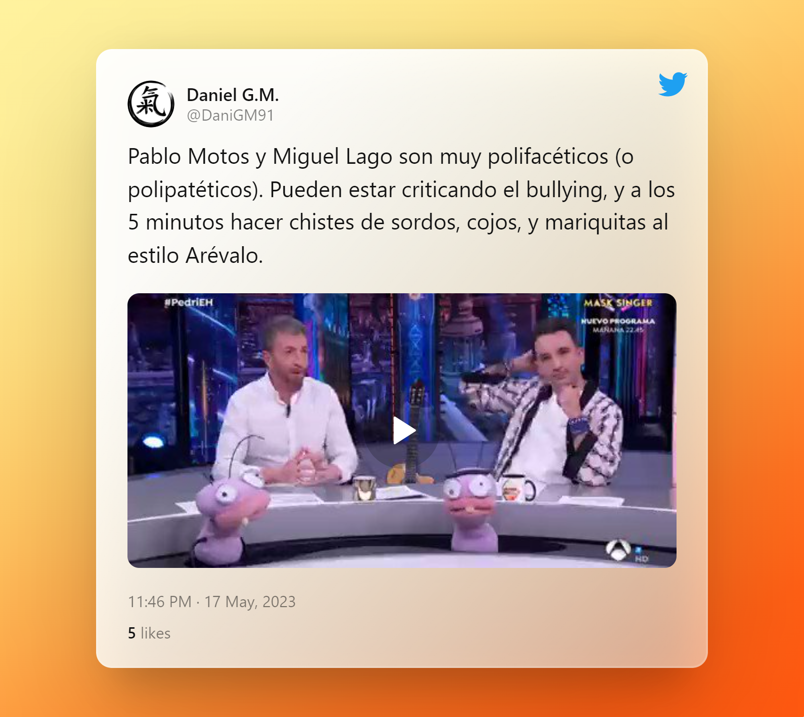El día que Pablo Motos confesó en 'El Hormiguero' cómo se arruinó en dos ocasiones: "Me pase un año sin sueldo""Miguel Lago lanza un aplaudido discurso contra el bullying para, 5 minutos después, reírse de una persona homosexual y con una discapacidad auditiva", afirma un usuario en Twitter. "Pablo Motos y Miguel Lago son muy polifacéticos (o polipatéticos). Pueden estar criticando el bullying, y a los 5 minutos hacer chistes de sordos, cojos, y mariquitas al estilo Arévalo", reconoce otro. Y es que, también señalan a este dúo como "los nuevos Bertin Osborne y Arévalo".