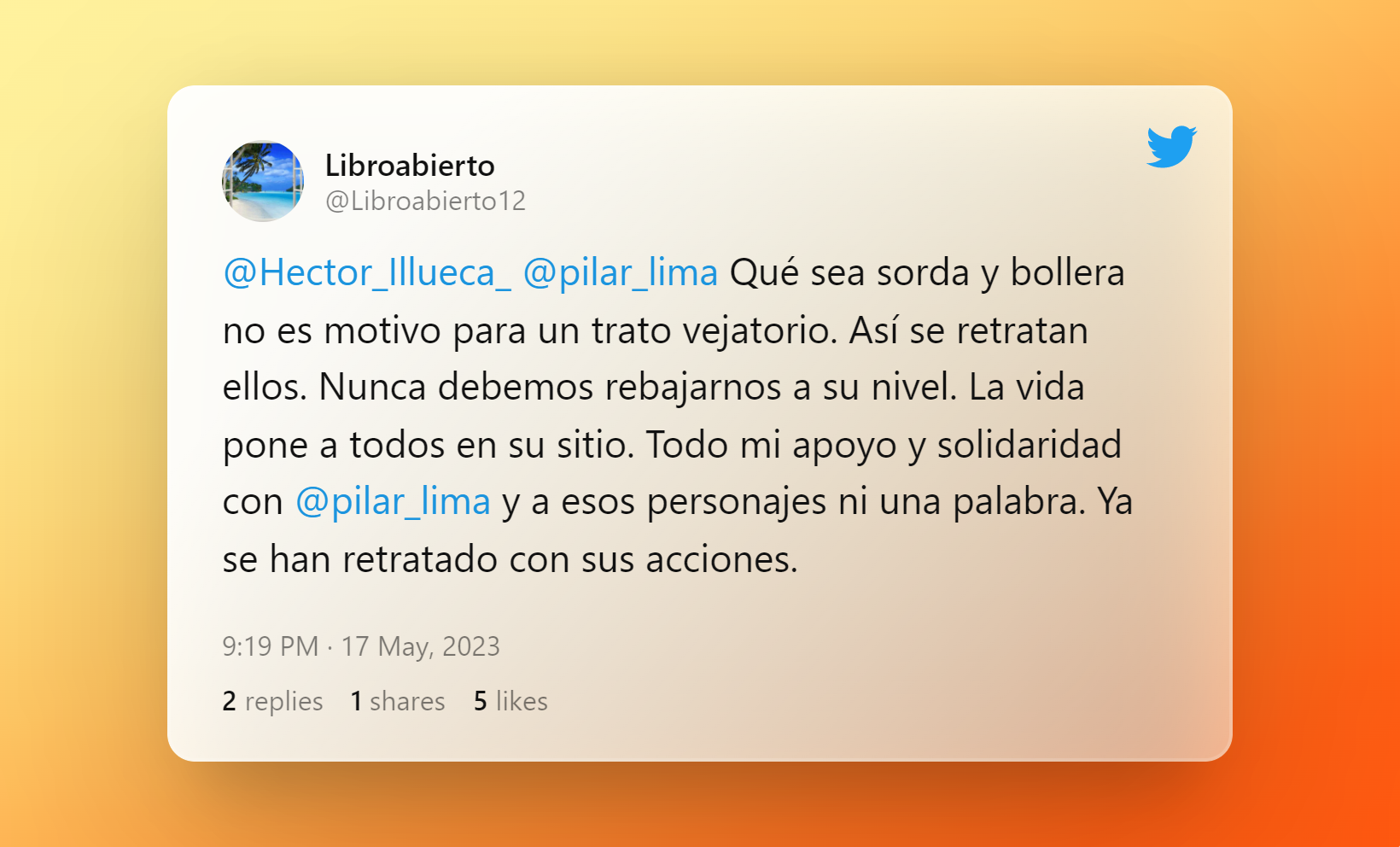 "Repugnante" o "vergonzoso" son las palabras más repetidas de la audiencia en Twitter. "Qué sea sorda y bollera no es motivo para un trato vejatorio", escribe otro usuario en la conocida red social. Además, señala que con esas declaraciones y risas de fondo "ellos mismos se retratan". Pero lo que más ha llamado la atención de los espectadores es el alegato que hizo antes de esta "burla".