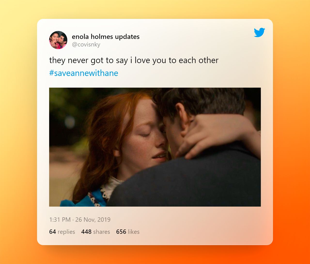 Realizaron una campaña en Twitter con el hasthag #RenewAnneWithAnE, utilizándose más de un millón de veces en su día, pero eso no significó de nada para el gigante del streaming. Moira Walley-Beckett, creadora de Anne With an E, explicó la principal razón por la que Netflix cancelase la serie en un comunicado que publicó en su cuenta oficial de Instagram: