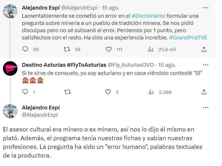 Hasta ahí puede parecer que todo bien. Sin embargo, un concursante de la localidad alicantina ha destapado supuestas irregularidades en esta prueba. Bajo el alias @alejandrespi, el participante lamenta que "se cometió un error" a consecuencia de una "pregunta sobre minería a un pueblo de tradición minera". De hecho, afirma que "se nos pidió disculpas, pero no sé subsanó el error". Un mensaje que ha provocado un gran revuelo en Twitter.