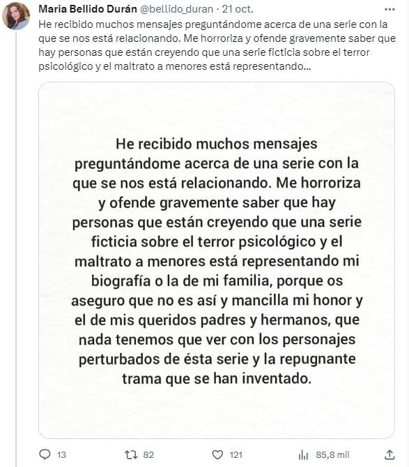 "He recibido muchos mensajes preguntándome acerca de una serie con la que se nos está relacionando", comienza la Flos Mariae, "Me horroriza y ofende gravemente saber que hay personas que están creyendo que una serie ficticia sobre el terror psicológico y el maltrato a menores está representando mi biografía o la de mi familia, porque os aseguro que no es así y mancilla mi honor y el de mis queridos padres y hermanos, que nada tenemos que ver con los personajes perturbados de ésta serie y la repugnante trama que se han inventado".