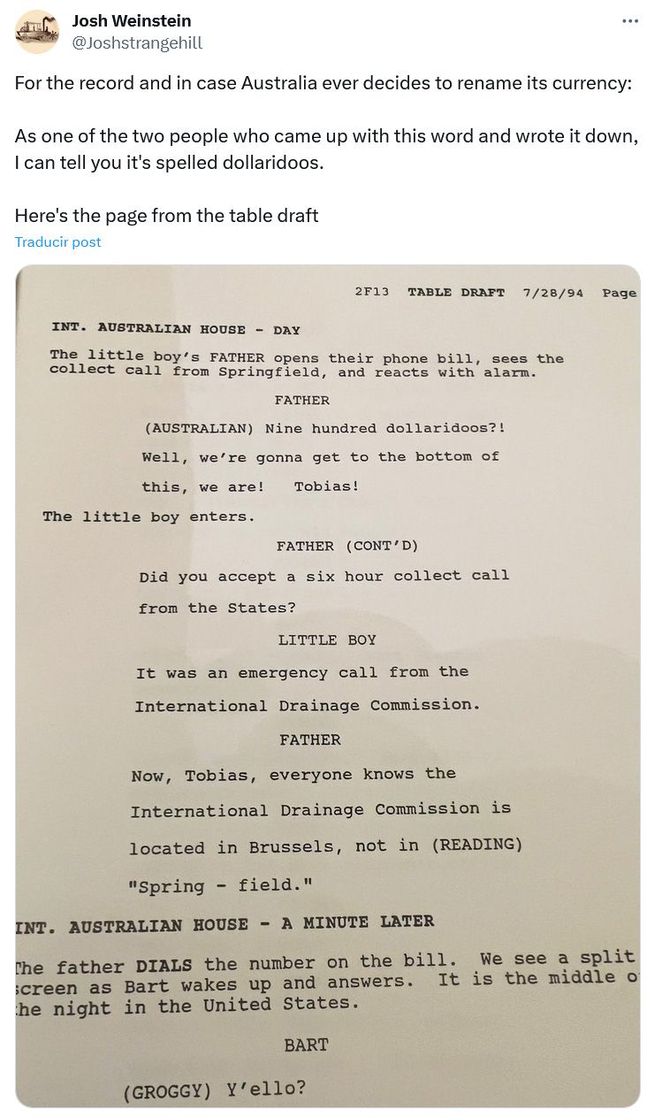Ni tanto ni tal calvo, al parecer. El guionista original Josh Weinstein, que suele responder en la red social las dudas y descubrimientos sobre la serie, especialmente del periodo que trabajó él, salió a corregir el error de la transcripción de la plataforma. Pasando una foto del borrador original del guion, se ve que la pronunciación del chiste es "dollaridoos".