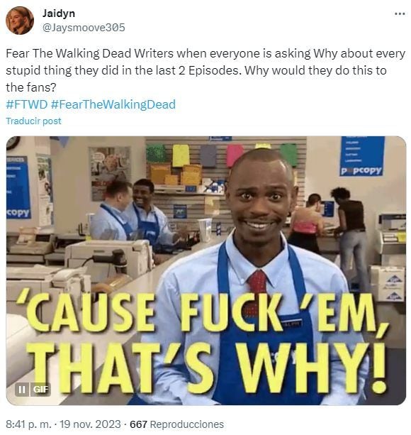 "Nadie se odia más a sí mismo en este mundo que la gente que ha permanecido pegada a FTWD durante las ocho temporadas", dice @DavidOpie. "Los guionistas cuando todo el mundo se pregunta '¿por qué?' con cada cosa estúpida que hacen en los últimos 2 episodios. ¿Por qué le harían esto a los fans?", escribe @Jaysmoove305.