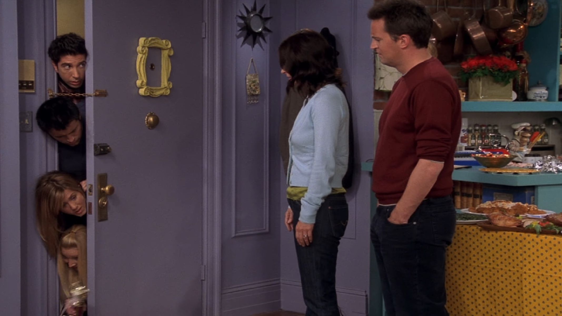 Quizá por eso uno de los planos más reconocibles de la serie es ese en el que Joey, Ross, Chandler y Rachel meten la cabeza por la puerta del piso de Mónica y Chandler en Acción de Gracias (el octavo de la temporada 10). Sin embargo, hay algo que falla en esa escena. Y es que la cadena que ataba la puerta del piso era mucho más corta (de 9 eslabones) y tuvieron que añadir cuatro más para que pudieran meter la cabeza ahí.