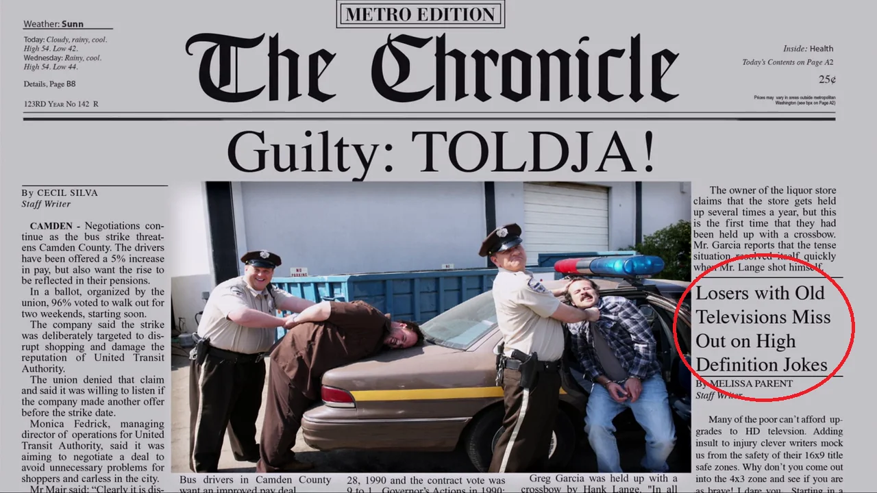 Y es que la serie llegó en ese momento en el que las series se preparaban para el paso a los 16:9 y la alta definición, pero aún se emitían en formato cuadrado, 4:3. Algunas se adaptaron regular (como Buffy o Malcolm in the middle), pero Me llamo Earl supo aprovechar el nuevo espacio al máximo, con bromas que solo podían verse en 16:9 como "Los perdedores con televisiones viejas se pierden bromas sobre la alta definición", "Carl Hickey adora la alta definición" o Randy, el hermano de Earl, sosteniendo un cartel en el que ponía "¡La alta definición mola!" ya en el mismísimo episodio 2.