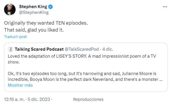 Un usuario de X escribió que le había encantado la adaptación del libro, pero que era "dos episodios demasiado largo". King, que no se le escapa nada en esta red social, le contestó rápido: "Originalmente, querían hacer DIEZ capítulos. Dicho esto, me alegro de que te haya gustado".