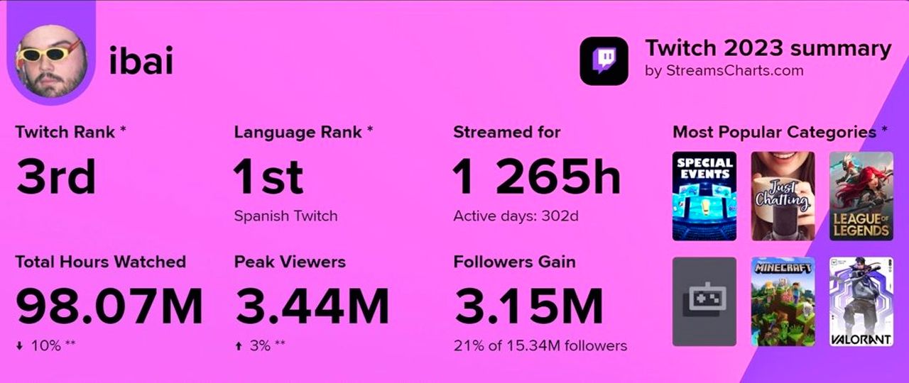 Este 2023, Ibai Llanos ha pasado 1.265 horas haciendo directo, ha sido visto 98,07 millones de horas y ha crecido 3,15 millones de seguidores. Unas cifras de auténtica locura que le consolidan como nuestro 'streamer' más importante.