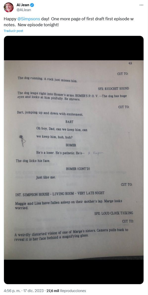 Una de las frases clave de toda la serie se da justo en ese final. "Es un perdedor, es patético es... Un Simpson". Una línea que no estuvo en un principio en el guion, tal y como ha compartido el guionista y showrunner Al Jean a través de Twitter, siendo un añadido posterior como se ve en la marca de bolígrafo en el borrador. Un añadido que encapsula todo lo que ha hecho la serie un éxito, porque sus personajes son sobre el papel unos perdedores sin suerte, objeto de broma, pero terminan siendo entrañables.