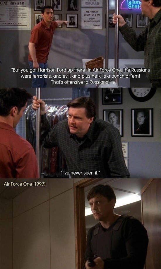 Cuando entra, el encargado dice que la serie es muy ofensiva para los suyos ("¿Los tintoreros?", responde Joey), afirmando que "Nos presentan como terroristas y delincuentes". Joey, entonces, señala una foto de Harrison Ford echando tierra sobre Air Force One ("En Air Force One los rusos son tratados de terroristas y malvados, y además él se carga un montón de ellos, eso sí es ofensivo"). El dependiente contesta que no la ha visto y Joey acaba el gag con un "Pues oye, es fantástica".