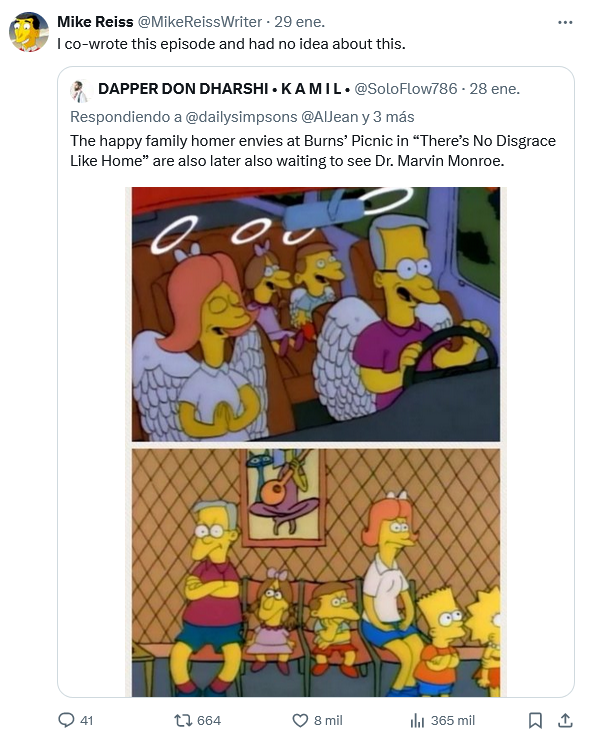 Un gran detalle que ha llamado mucho la atención en redes sociales como Twitter/X y ha sorprendido a todo quisqui. Hasta el guionista de aquel capítulo, Mike Reiss, se quedó perplejo con el guiño rescatado: “Co-escribí este episodio y no tenía ni idea de esto”. Es difícil saber si fue una decisión consciente pensada para hacer humor o simplemente una manera de los animadores para ahorrar trabajo evitando diseñar otra familia distinta, pero la verdad es que funciona de perlas.
