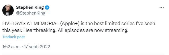 Stephen King quiere que veas Después del huracán. Se trata de una miniserie de Apple TV+ que se estrenó el 12 de agosto de 2022 y que narra las terribles consecuencias del huracán Katrina. "Es la mejor miniserie que he visto este año. Descorazonadora", escribe King en su 'tweet'.